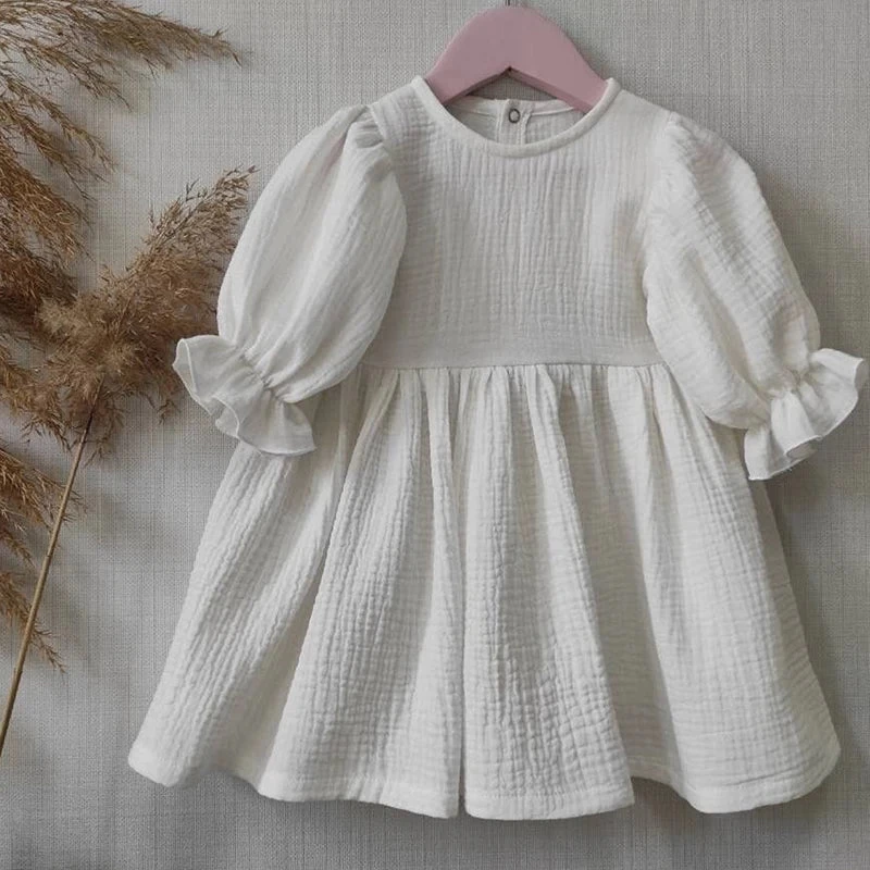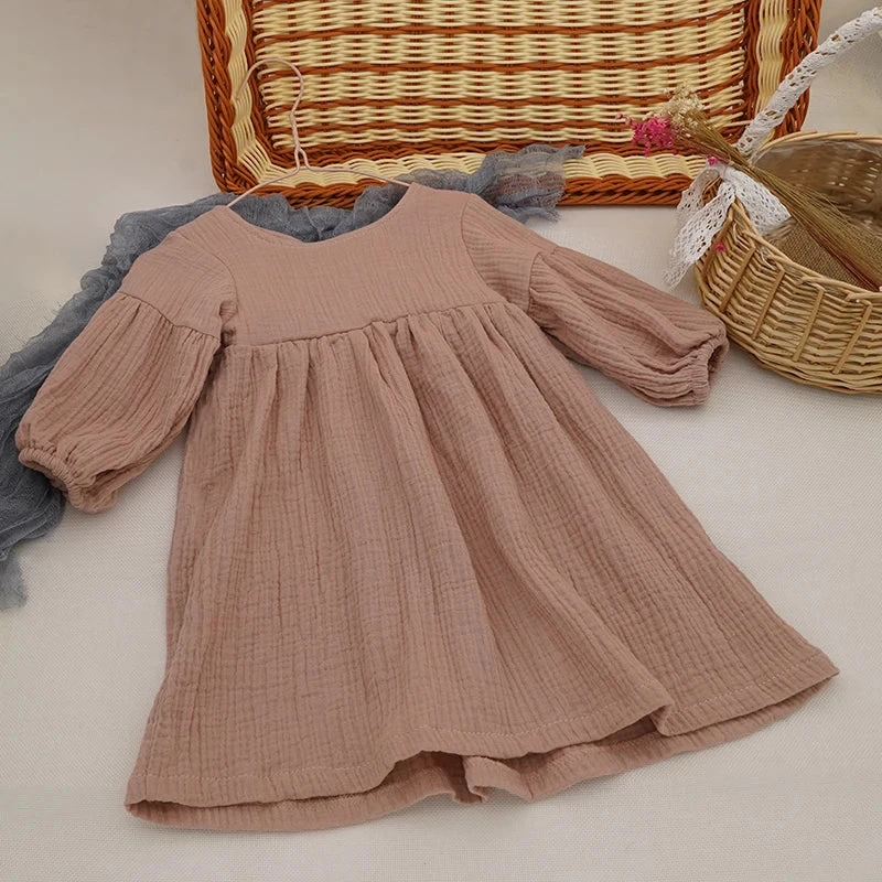 This dress is thoughtfully designed for girls aged 7-12 months, 13-24 months, and 4-6 years. The mid-calf length and O-neck collar give it a timeless appeal, while the full lantern sleeves enhance its playful character. Available in solid colors, this dress can easily be paired with various accessories to create unique looks.