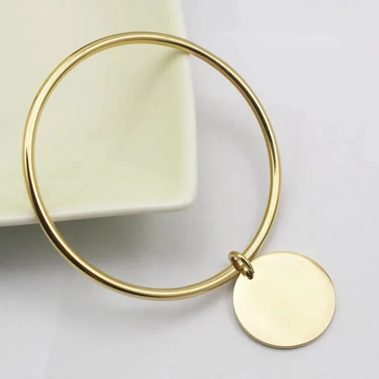 Elevate your style with the Classic Round Golden Charm Bangle Bracelet Stainless Steel Women Fashion Jewelry Gold Color. This exquisite piece of jewelry is designed to bring a touch of elegance to any outfit, making it the perfect accessory for the modern, fashion-forward woman. Crafted from high-quality stainless steel, this bangle bracelet is not only durable but also features a stunning gold plating that shines brilliantly, ensuring you stand out in any occasion.