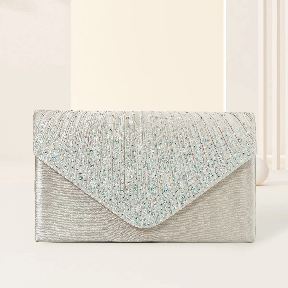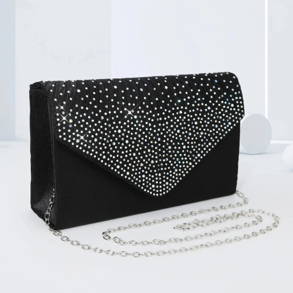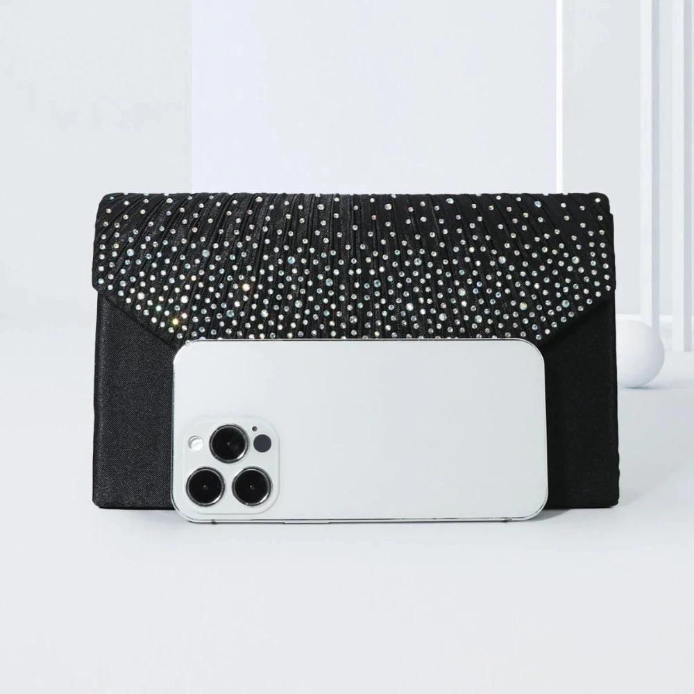 The Elegant Rhinestone Evening Bag Ruched Clutch Purse Luxury Flap Handbag boasts a captivating ruched design adorned with shimmering rhinestones that catch the light beautifully. The sophisticated flap closure adds an extra layer of elegance while ensuring your essentials are securely tucked away.