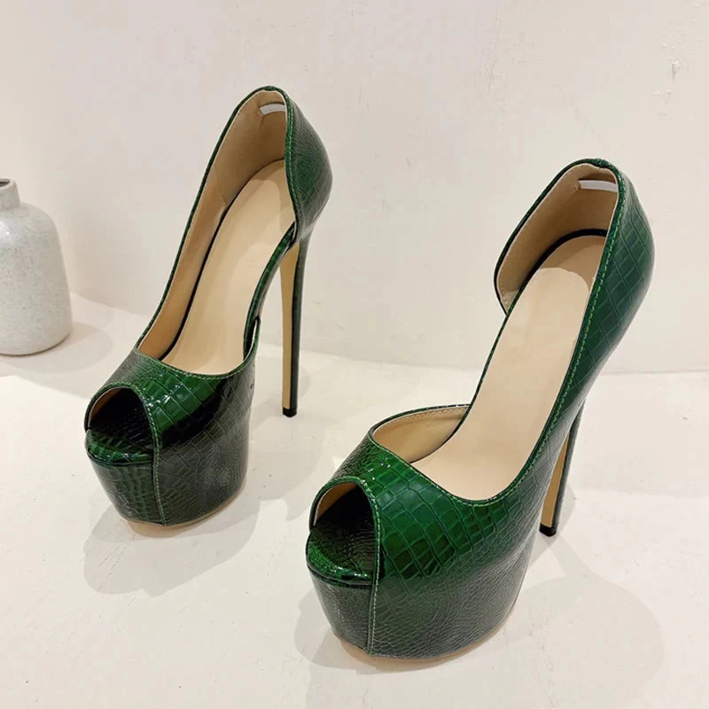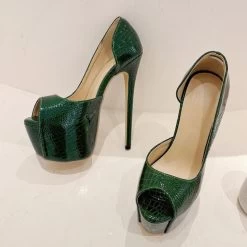Step into the spotlight with the Green Snake Print Leather Platform Pumps Women Sexy Slingback Peep Toe Extreme High Heels Strip Pole Dance Shoes. Designed for the bold and stylish, these pumps feature a mesmerizing green snake print leather that immediately captures attention. With an impressive platform height of 5-7cm and super high heels exceeding 8cm, you’ll not only add height but also confidence to your every move.