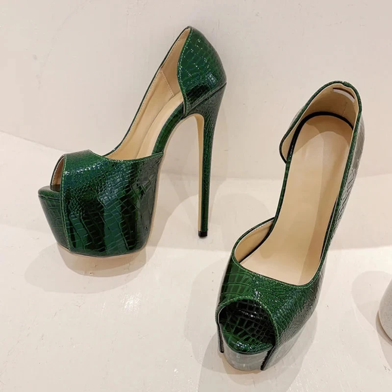 Steal the show with these sssizzling hot peep toe pumps! Featuring a stunning green snake print leather design and a sky-high platform, these shoes will elevate your style to new heights. Perfect for adding a playful and sexy touch to your pole dancing routine. Slip into these slingback heels and slay all day!