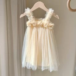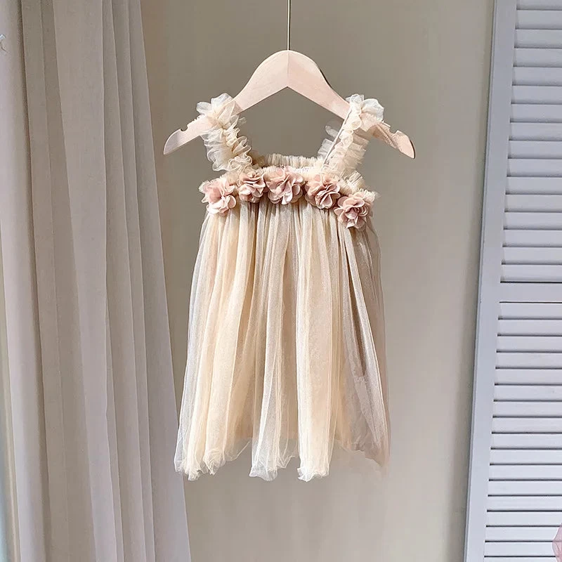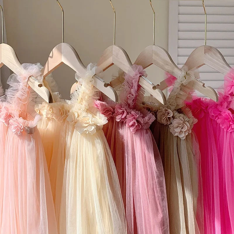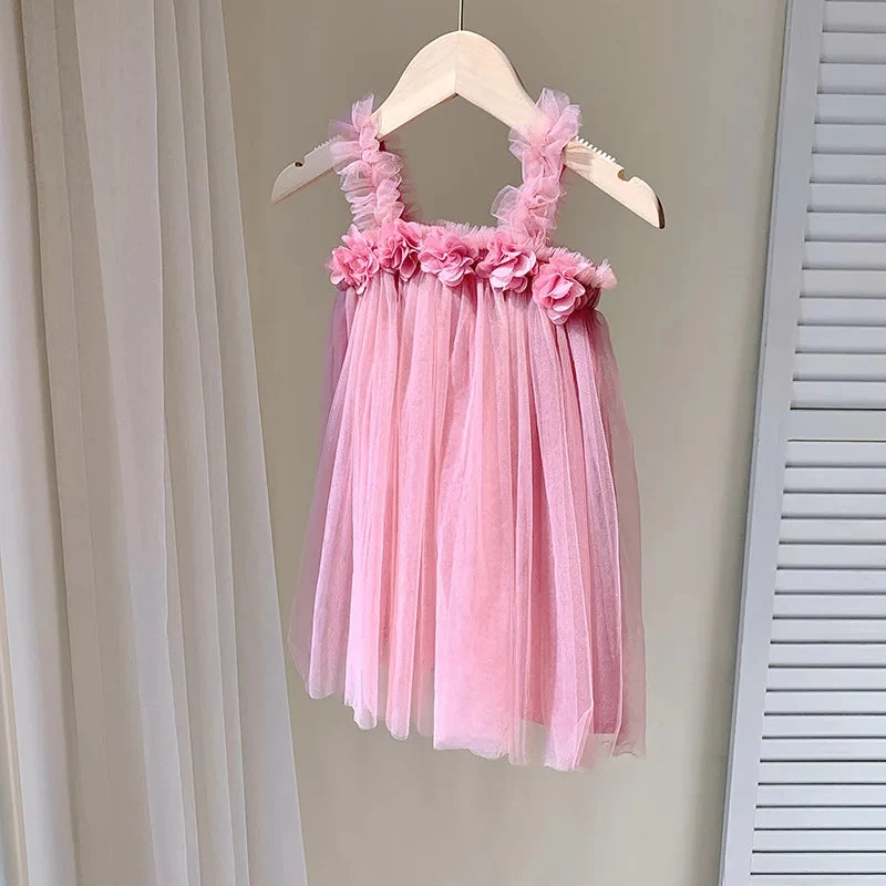 Transform your little one into a sweet beauty with our Kids Girl Dress. Made with a 3D flower sling design, solid color mesh fabric, and a fluffy skirt, this dress is perfect for a day at the beach or a special occasion. Let your child shine like a beach princess in this adorable outfit!
