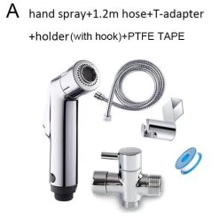 - A: Bidet sprayer + 1.2 meter hose + T-adapter + holder with hook + PTFE tape