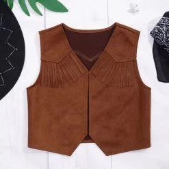Get ready for a rootin’-tootin’ adventure with the Wild West Cosplay Cowboy Cowgirl Costume Halloween Dress Up Clothes for Kids New Fringe Sleeveless Vest with Bandanna Hat Set. This amazing costume is designed for little ranchers who want to embrace the spirit of the Wild West! Perfect for Halloween, dress-up parties, or imaginative playtime, this outfit allows your child to step into the boots of a daring cowboy or a fierce cowgirl.