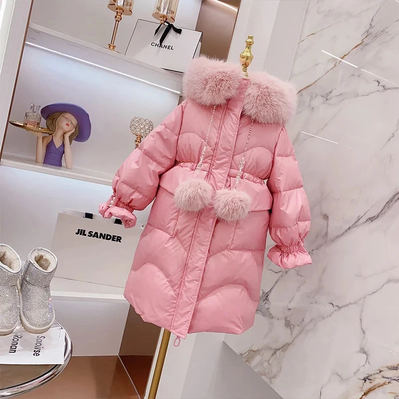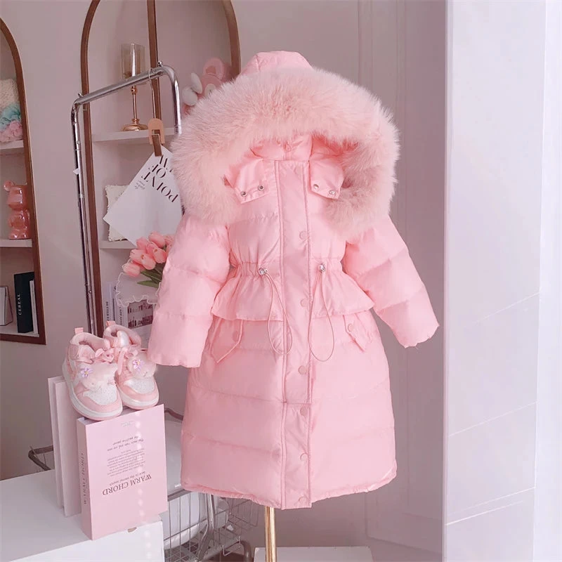 Choose the Winter Girls Sweet Long Down Jackets Hooded Big Fur Collar Kids Parkas Children Clothes Girls Windproof Thicken Warm Coats this winter and ensure your child stays both warm and stylish!