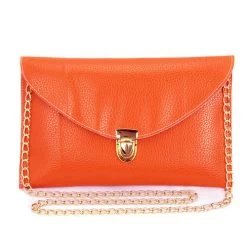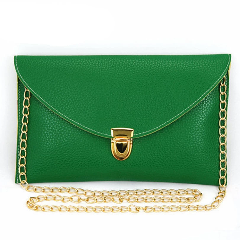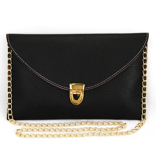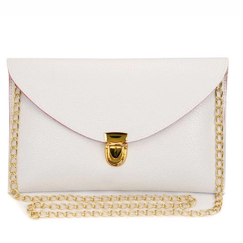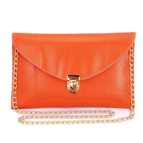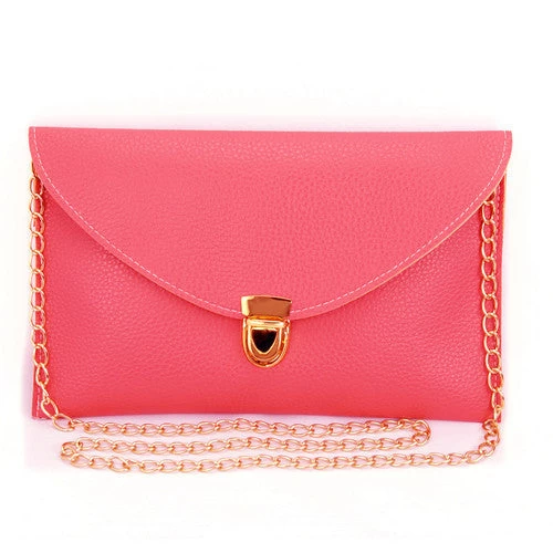 Crafted from high-quality PU leather, this bag features a unique envelope shape that exudes elegance. The vibrant candy colors—available in shades of White, Yellow, Blue, Black, and Pink—add a playful touch to your outfit, while the decorative button and chain accents enhance its visual appeal.